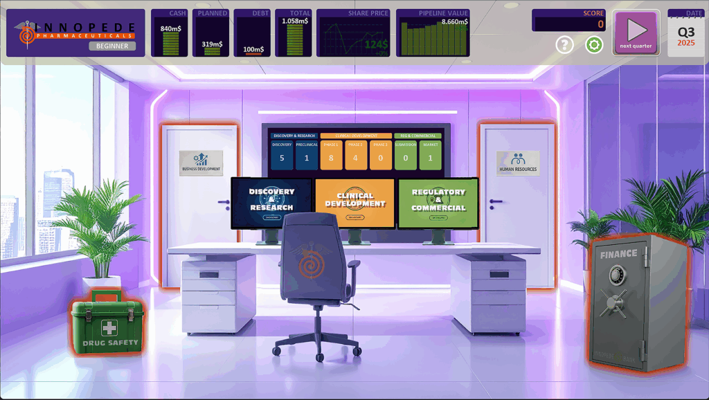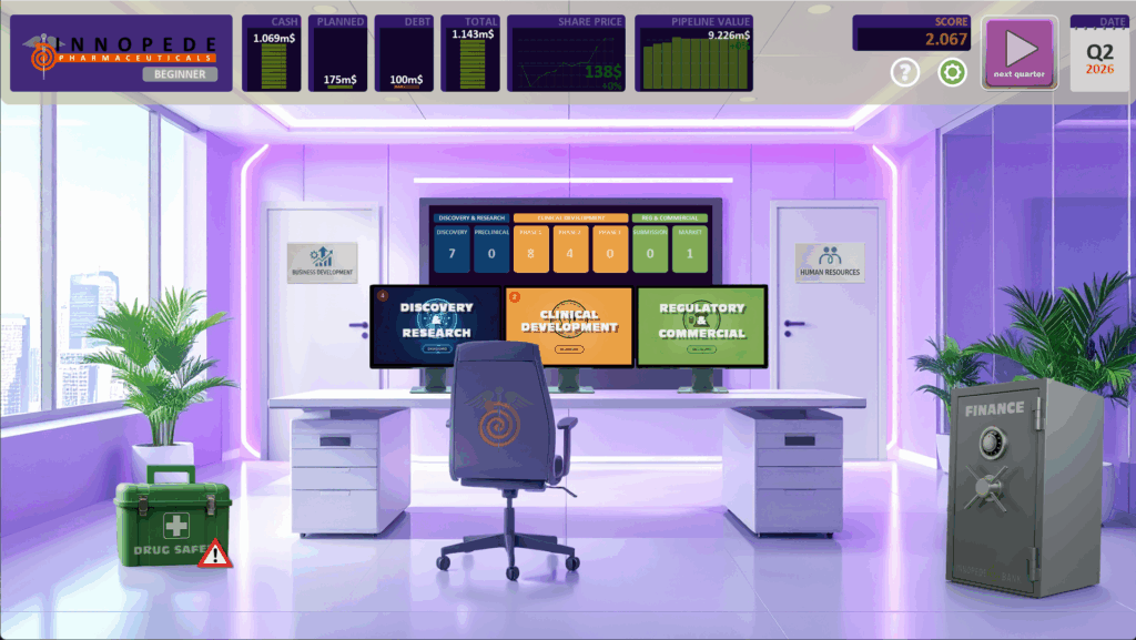 Pharma R&D Manager is a round-based strategy game. Before a new quarter (next round) starts you can adjust your project portfolio, make HR decisions, buy and sell projects/compounds, adjust financials, check drug/patient safety profiles of your products etc.
