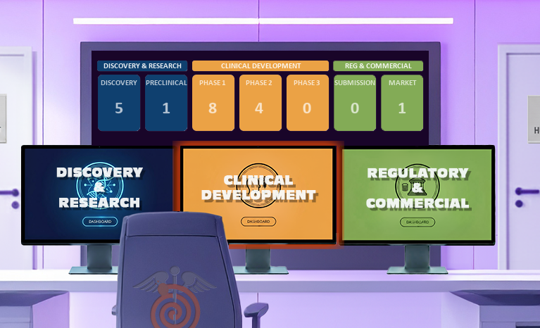 here you can select the different functional dashboards by clicking on the screens for DISCOVERY & RESEARCH, CLINICAL DEVELOPMENT or REGULATORY & COMMERCIAL.